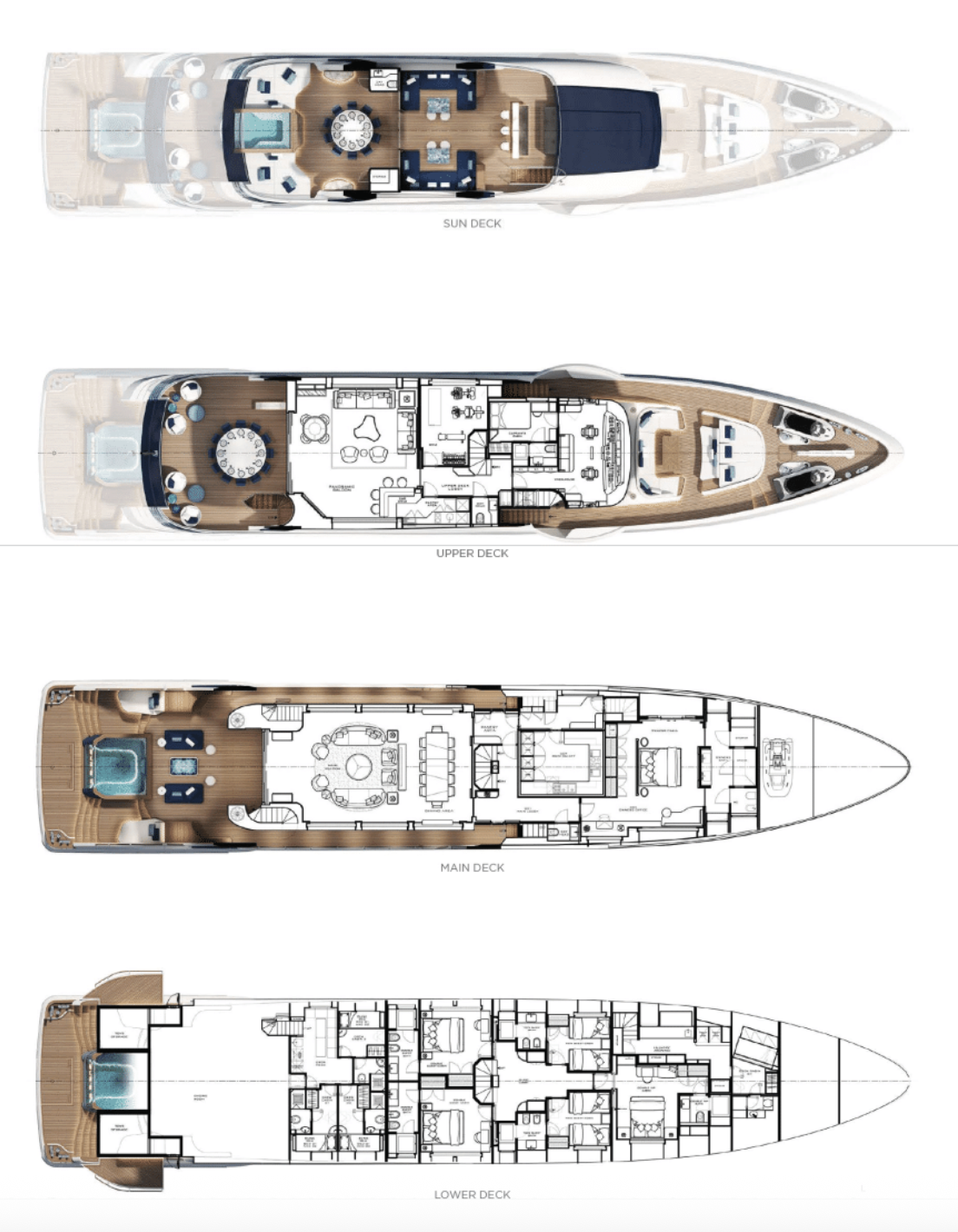 Dưới bàn tay thiết kế tài hoa của Cristiano Gatto ở cả nội – ngoại thất, Majesty 145 được tạo tác để “ôm trọn” lấy đại dương. Hệ thống kính kịch trần và lan can kính trong suốt tối đa hóa ánh sáng tự nhiên, mở ra tầm nhìn panorama vô cực. Sự kết nối liền mạch giữa các không gian tạo nên một dòng chảy liên tục, khiến mỗi khoảnh khắc trên thuyền đều được bao bọc bởi màu xanh bất tận của biển trời. Các boong thuyền vươn dài vừa tạo không gian thư giãn ngoài trời hào phóng, vừa mang lại bóng mát tự nhiên cho tầng dưới, đạt đến sự cân bằng hoàn hảo giữa thẩm mỹ và công năng.