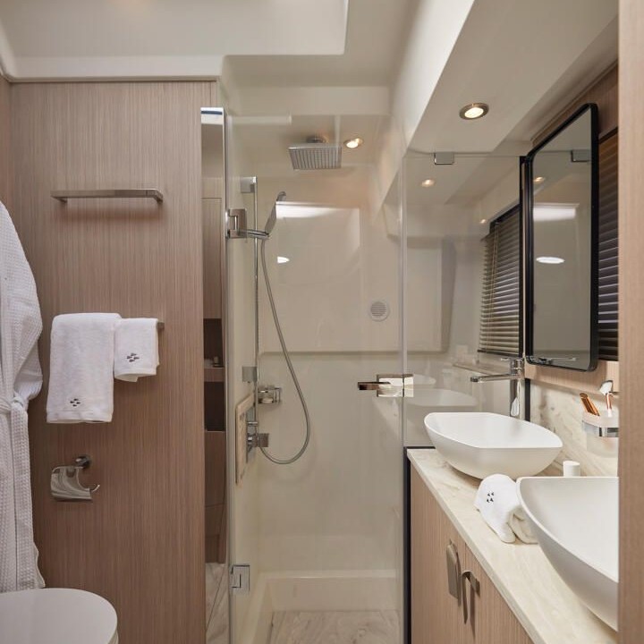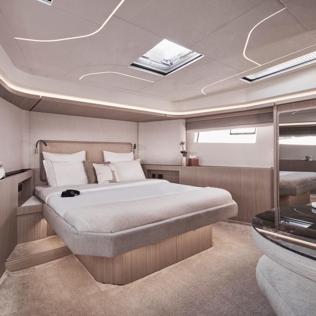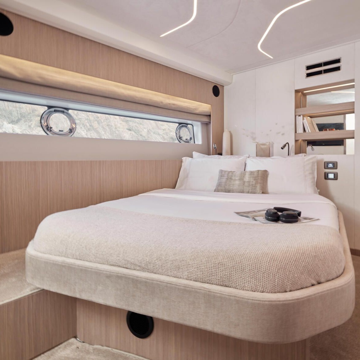 Tầng boong dưới của F5.7 được bố trí 3 cabin tiện nghi: phòng ngủ chủ thuyền rộng rãi nằm ở mũi thuyền, phòng ngủ VIP sang trọng, và một phòng ngủ ở giữa thân thuyền. Điểm nhấn thiết kế nằm ở chiếc giường đặt chéo trong phòng chính – một giải pháp thông minh giúp tối ưu không gian và tạo sự thoải mái khi di chuyển quanh khu vực nghỉ ngơi.