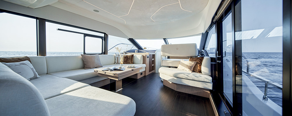 Ngay khi bước lên du thuyền, bạn dễ dàng nhận ra ADN Prestige, song song là những cải tiến tinh tế, hiện đại, thể hiện trong cách không gian nội – ngoại được kết nối mượt mà và liền mạch hơn bao giờ hết. Khu vực sinh hoạt và bàn ăn ngập tràn ánh sáng tự nhiên nhờ hệ thống cửa kính bao quanh, mang lại cảm giác rộng mở và gần gũi với thiên nhiên. Gian bếp mở hướng ra khoang sau không chỉ là trung tâm nấu nướng mà còn đóng vai trò là điểm giao thoa giữa nội thất và khu vực thư giãn ngoài trời, nơi sofa được bố trí dọc theo trục trung tâm, mở rộng tầm nhìn thẳng ra biển cả.